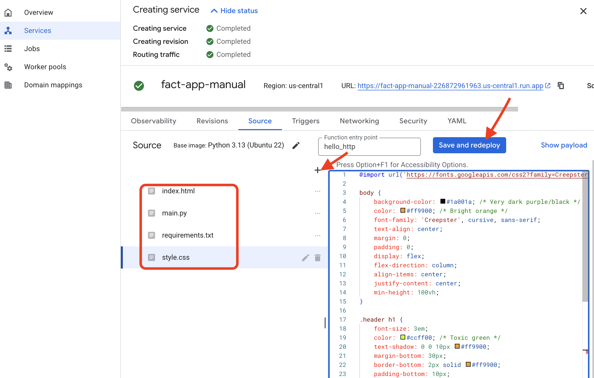 gcloudCLI to deploy the entire application from your current directory.gcloud run deploy fact-app-cli \ --source . \ --region us-central1 \ --allow-unauthenticated