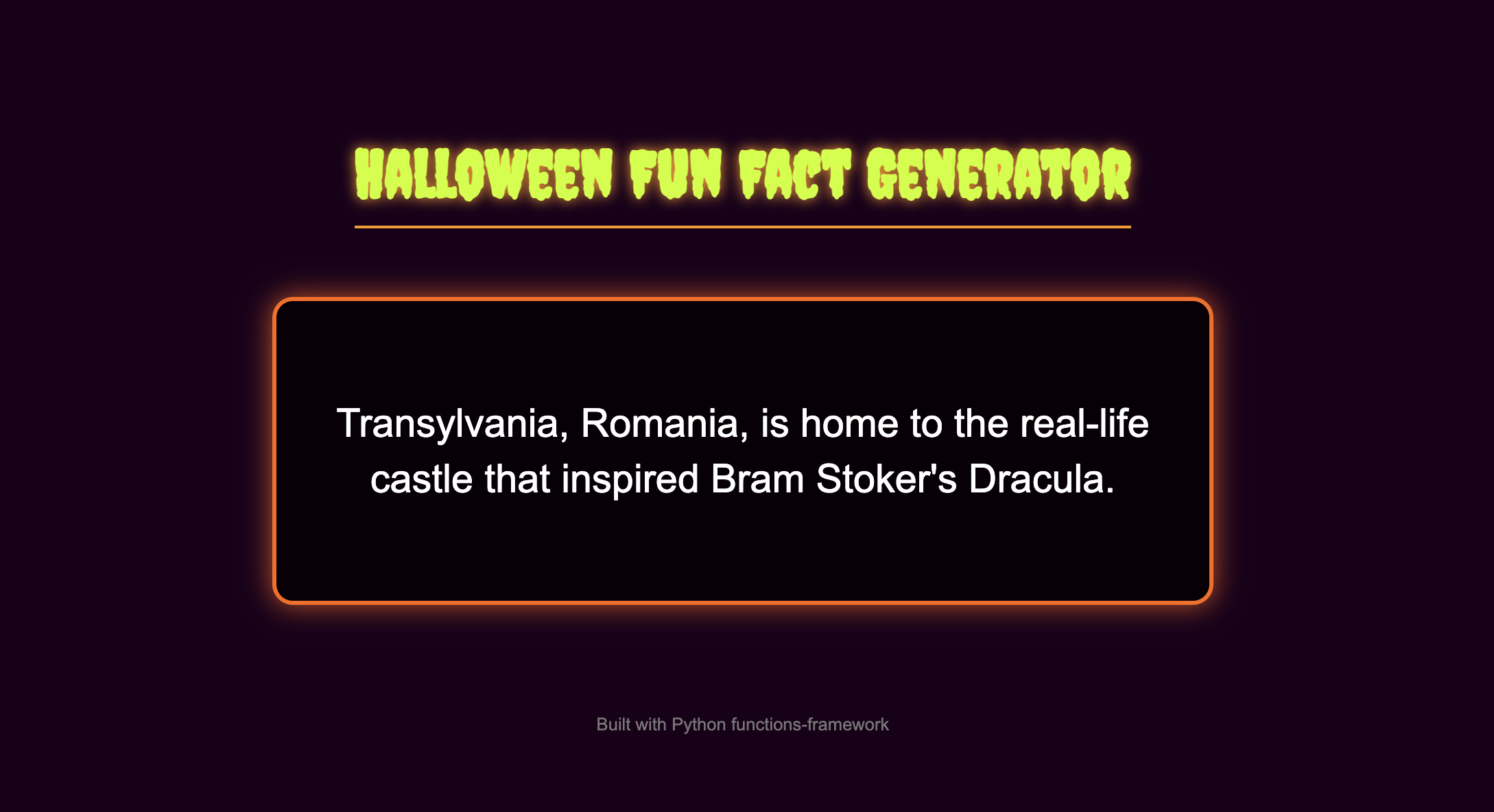 Create the code for a simple web application that shows Halloween fun facts. The application should be built using the Python functions_framework for Cloud Run. The entry point function must be named 'hello_http'. When a user visits the main page, the server should randomly display one fact from a list. The page should have a separate 'index.html' file for the structure and a 'style.css' file to give it a spooky theme