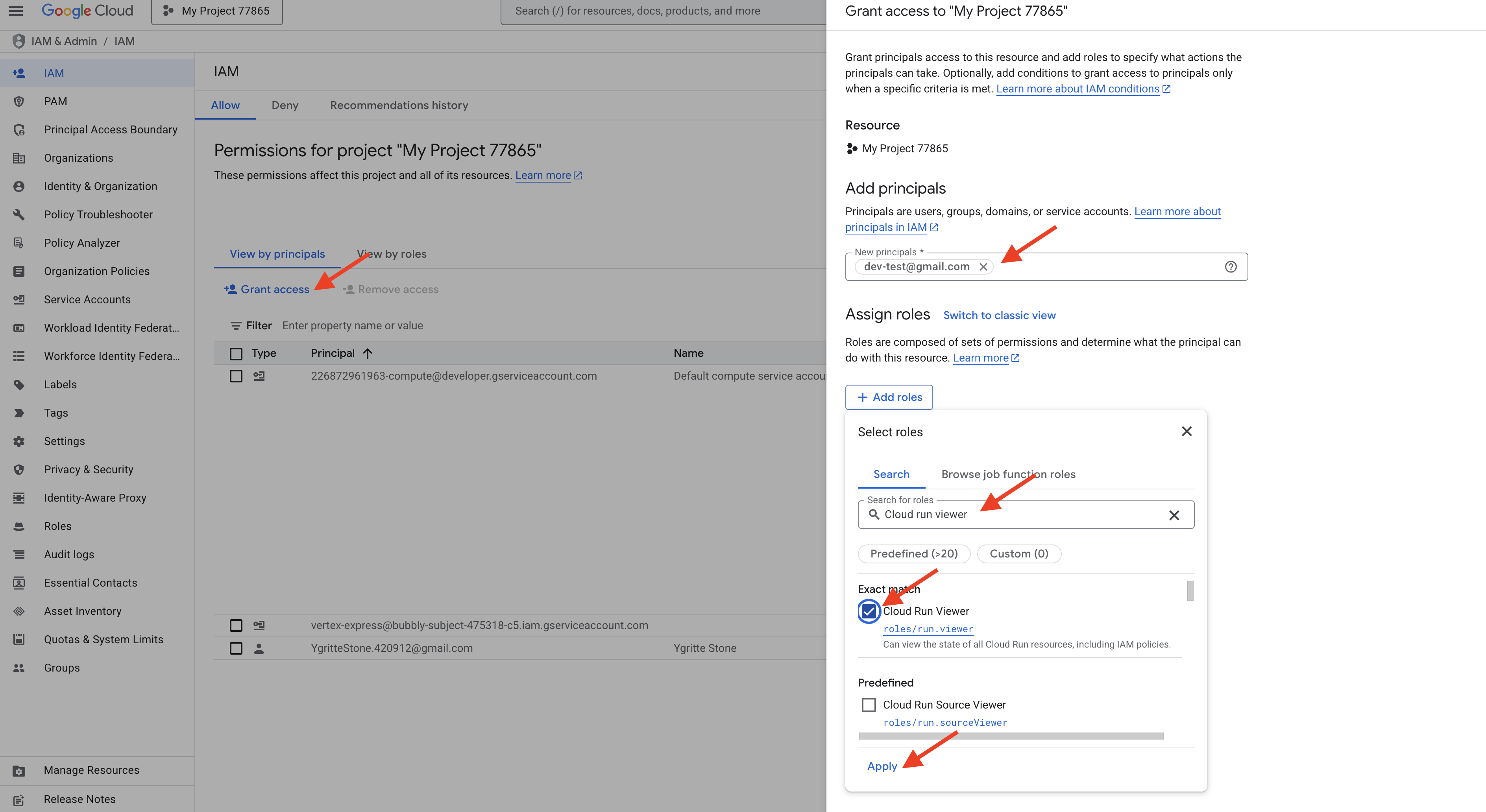 dev-intern@example.com. - In the Select a role dropdown, use the filter to find and select the role "Cloud Run Viewer". This role is a perfect example of the Principle of Least Privilege. It grants read-only access specifically to Cloud Run services and nothing more. (Or try use the Help me choose roles)