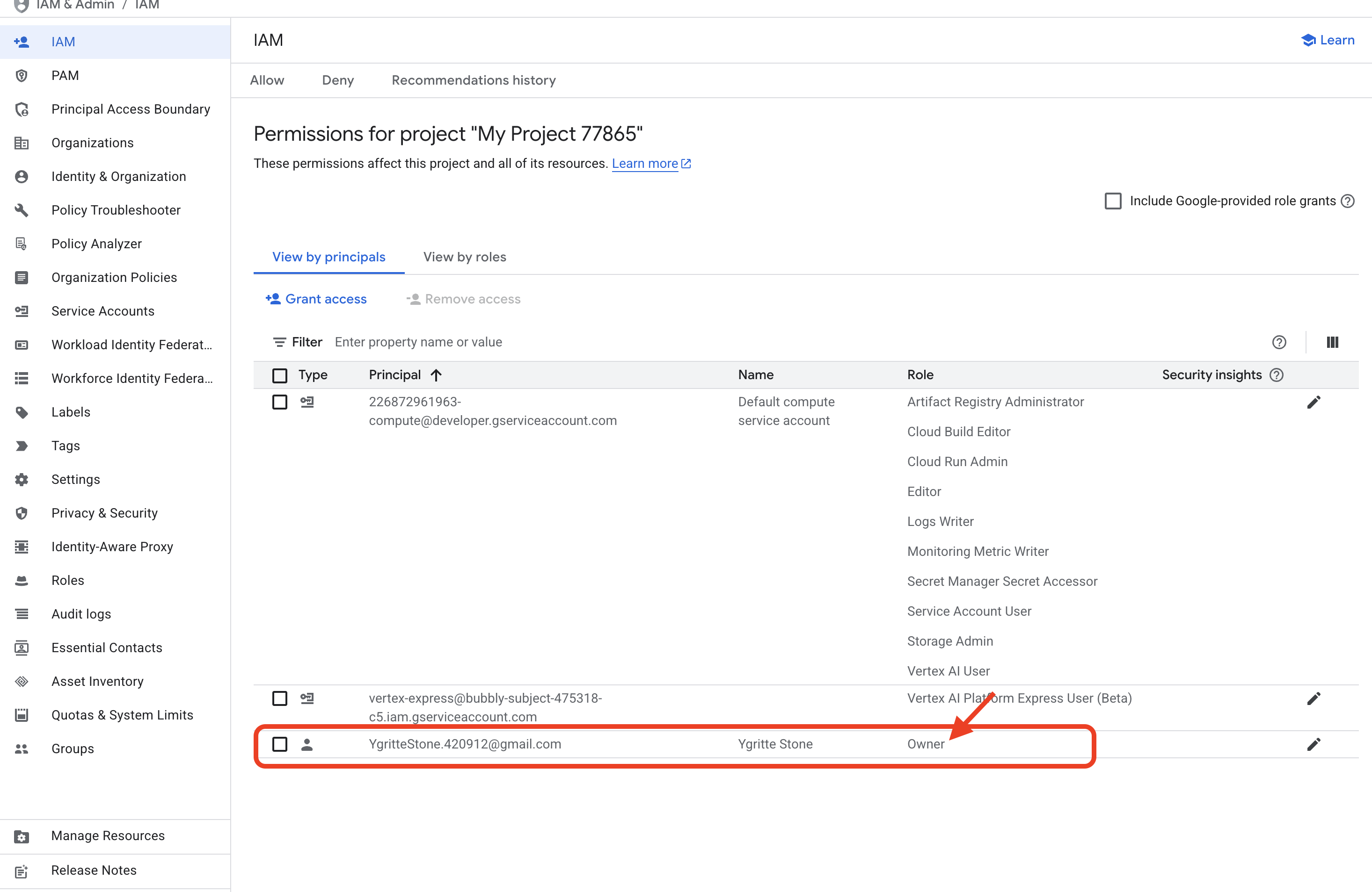 - In the list of Principals, find your own email address. Notice that its Role is "Owner". The Owner role grants full, unrestricted permission to do anything in the project. This is why you were authorized to enable APIs and run the