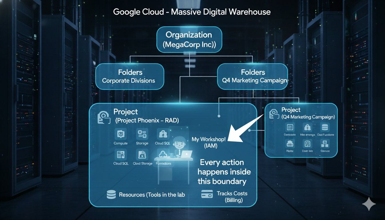 您可以将 Google Cloud 视为一个巨大的数字仓库,其中装满了强大的工具和服务。项目是您在数据仓库中拥有的私密安全空间。它是一个容器,用于存放您的所有资源(例如服务器、数据库和代码)、跟踪您的所有费用,以及管理哪些人可以进入并使用其中的工具。我们今天执行的所有操作都将在此项目边界内进行。