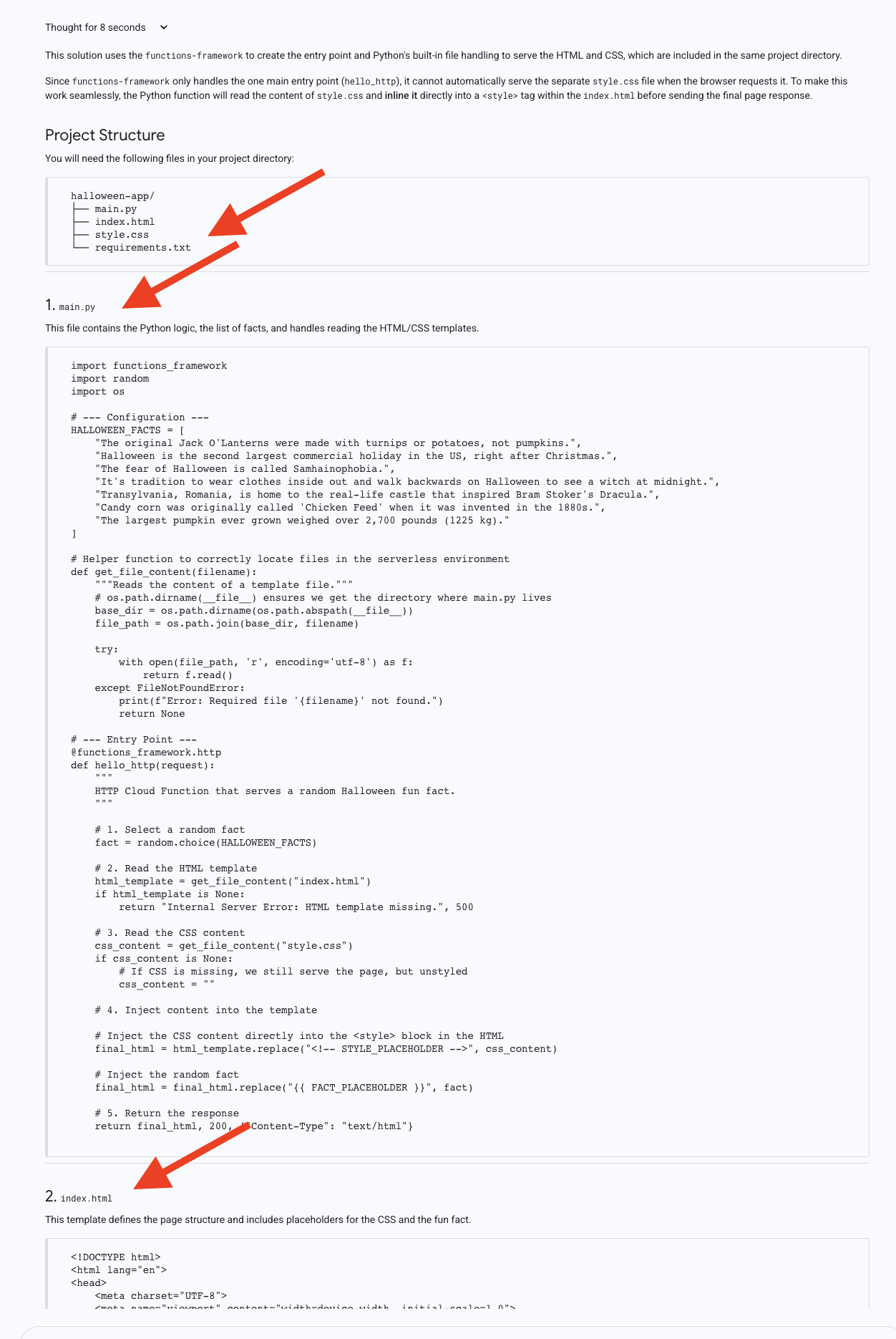 Create the code for a simple web application that shows Halloween fun facts. The application should be built using the Python functions_framework for Cloud Run. The entry point function must be named 'hello_http'. When a user visits the main page, the server should randomly display one fact from a list. The page should have a separate 'index.html' file for the structure and a 'style.css' file to give it a spooky theme