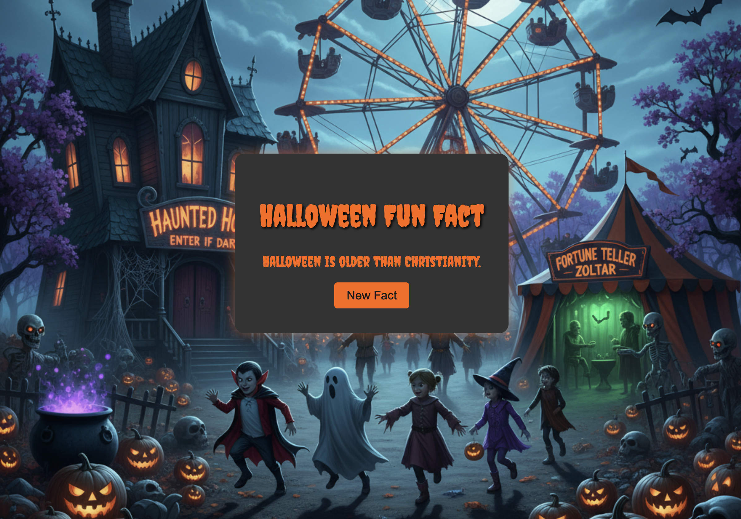 Write a simple web app that shows Halloween fun facts using the Python Flask. When a user visits the main page, it should show one random fact. Include a button that fetches and displays a new fact when clicked. Create a simple, clean index.html, a separate style.css with a spooky theme, and a requirements.txt file. After creating the files, attempt to start the web app locally on port 8080. - 在本地测试:AI 将创建文件并启动 Web 服务器。(有时加载不会停止,如果您看到它正在尝试启动服务器,请随意前往下一步。)