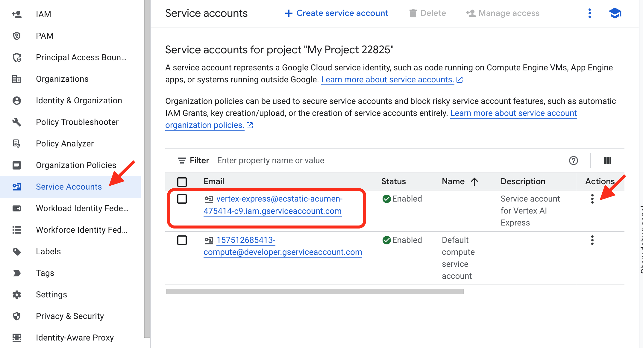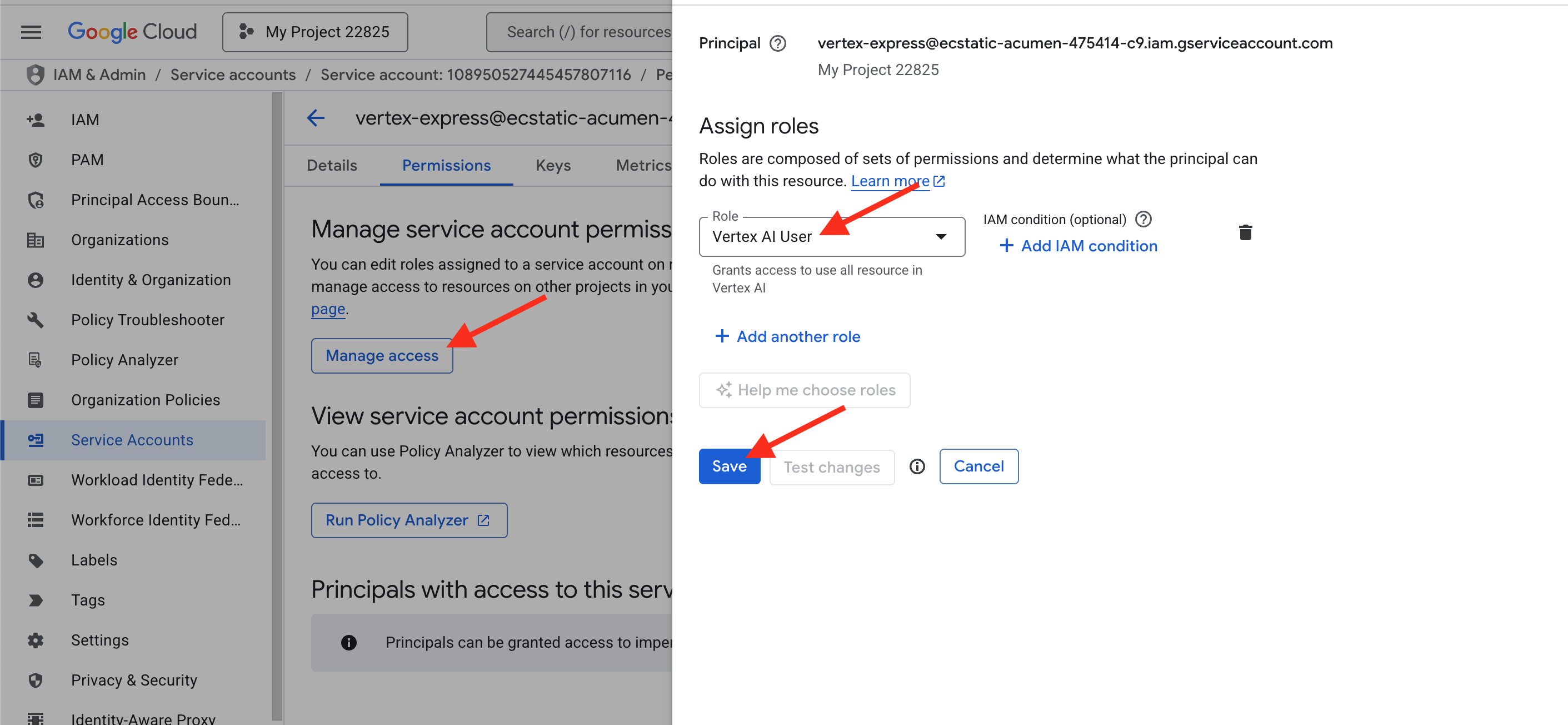 vertex-express@ecstatic-acumen-{PROJECT_NUMBER}-c9.iam.gserviceaccount.com的服务账号。(您需要将{PROJECT_NUMBER}替换为您的实际项目编号)。这是我们要授予权限的身份。