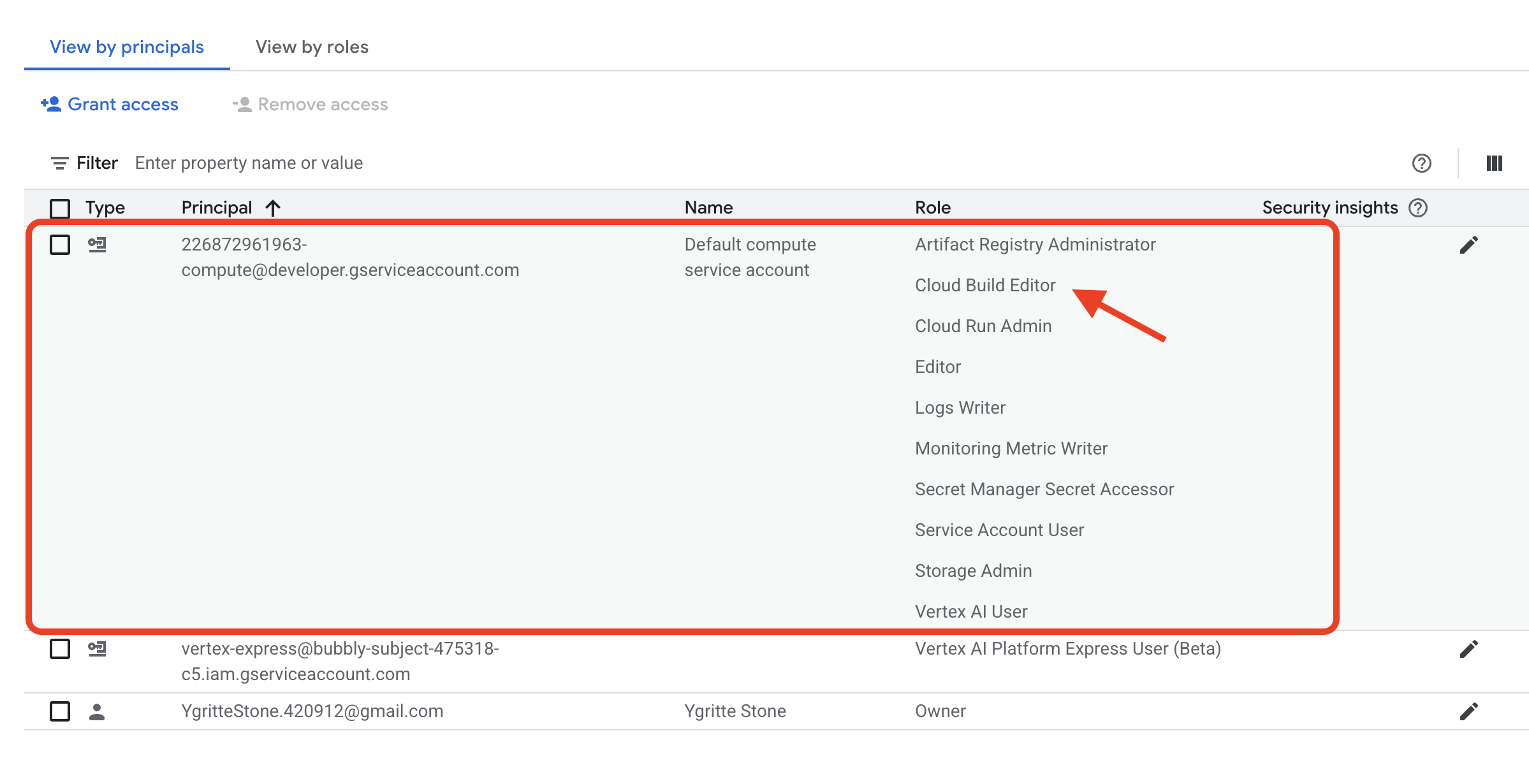 [PROJECT_NUMBER]-compute@developer.gserviceaccount.com的主账号。这是 Cloud Build 服务使用的默认服务账号。 - 查看其角色。它将具有 “Cloud Build Service Agent”之类的角色。此角色包含执行其工作所需的特定权限,例如拉取源代码和将容器映像写入注册表。这是为您的部署完成繁重工作的身份。