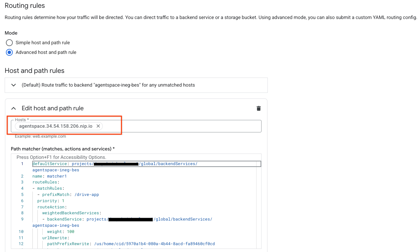 You are now presented with creating a new host and path rule, in the hosts section insert agentspace.YOUR-EXTERNAL-IP.nip.io or custom domain.