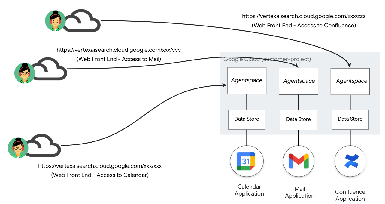 Continued growth of datastore and subsequent applications results in further management of Public Google-managed URLs as depicted in the deployment scenario below, (Figure 2) resulting in a 1:1 mapping of Agentspace applications and URL.