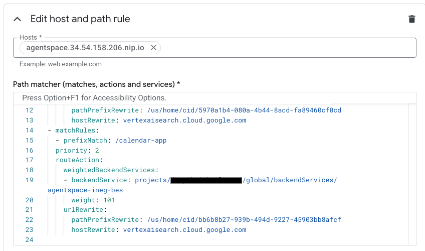 - PathPrefixRewrite is the Agentspace path: /us/home/cid/5970a1b4-080a-4b44-8acd-fa89460cf0cd