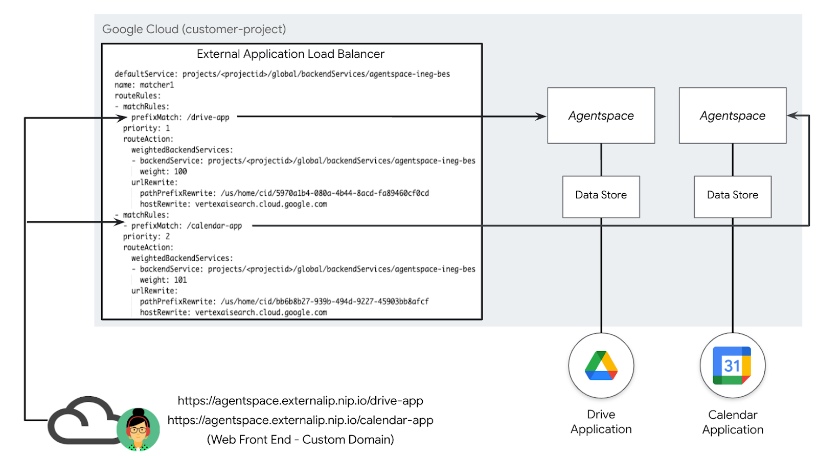 - Backend service routes traffic to the drive-app application based on the Agentspace URL