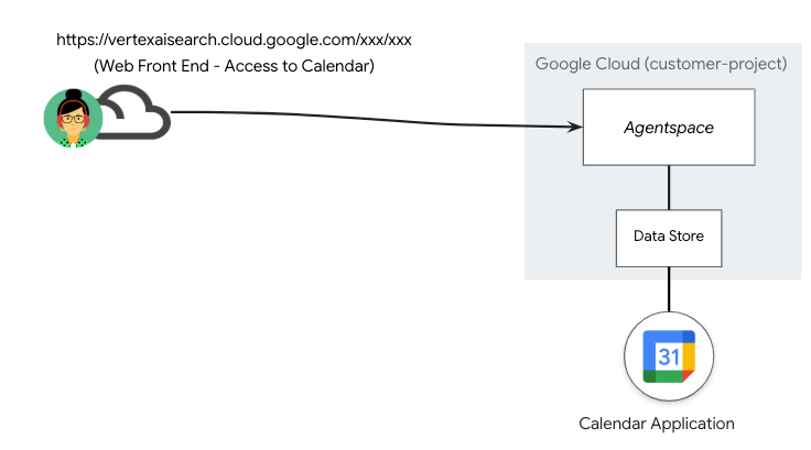 Dans le scénario de déploiement illustré ci-dessous (figure 1), AgentSpace a publié un datastore contenant une application Agenda accessible via une URL publique gérée par Google.