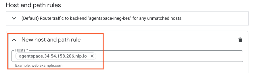 Vous pouvez maintenant créer une règle d'hôte et de chemin d'accès. Dans la section "Hosts" (Hôtes), saisissez agentspace.VOTRE-ADRESSE-IP-EXTERNE.nip.io ou un domaine personnalisé.