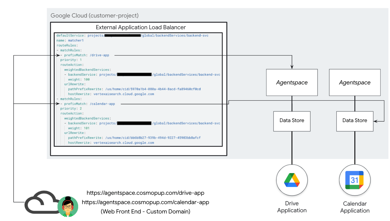 Les règles d'hôte et de chemin de l'équilibreur de charge d'application externe,configurées via le mappage d'URL, contrôlent la logique qui met en correspondance le domaine personnalisé avec l'URL gérée par Google. Il effectue la fonction suivante à l'aide de l'exemple agentspace.cosmopup.com/drive-app.