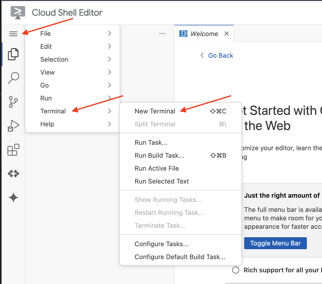 👉לוחצים על Activate Cloud Shell בחלק העליון של מסוף Google Cloud (הסמל הזה נראה כמו טרמינל בחלק העליון של חלונית Cloud Shell), לוחצים על הלחצן 'פתיחת Editor' (הוא נראה כמו תיקייה פתוחה עם עיפרון). ייפתח בחלון Cloud Shell Code Editor. בצד ימין יופיע חלון של 'סייר קבצים'.