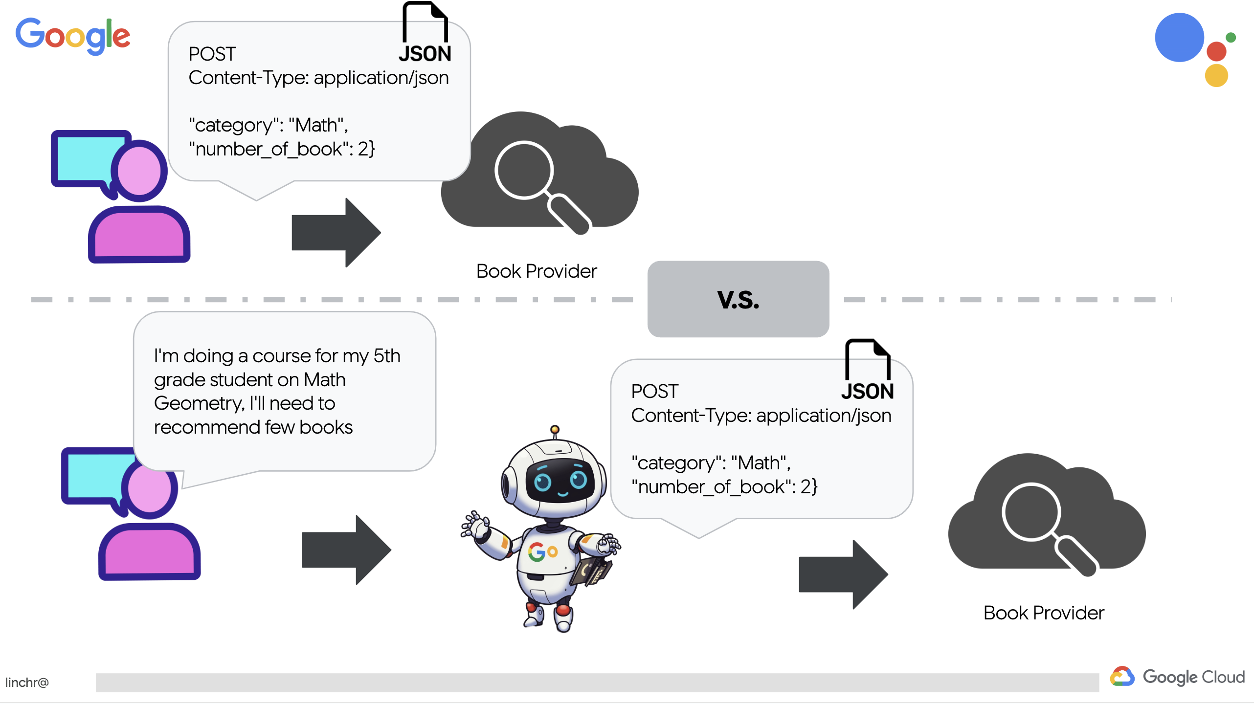 לפני שנצלול למערכות מורכבות עם מספר סוכנים, אנחנו צריכים להגדיר אבן בניין בסיסית: סוכן פונקציונלי יחיד. בקטע הזה נתחיל ליצור סוכן פשוט מסוג 'ספק ספרים'. הסוכן של ספק הספרים מקבל קטגוריה כקלט ומשתמש ב-LLM של Gemini כדי ליצור ספר ייצוג בפורמט JSON בקטגוריה הזו. לאחר מכן, המערכת מציגה את המלצות הספרים האלה כנקודת קצה של API ל-REST .