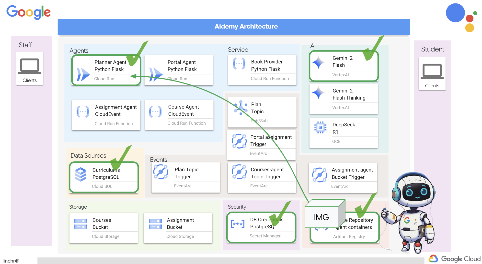 - Cloud SQL: מסד נתונים של PostgreSQL לנתוני תוכנית הלימודים.