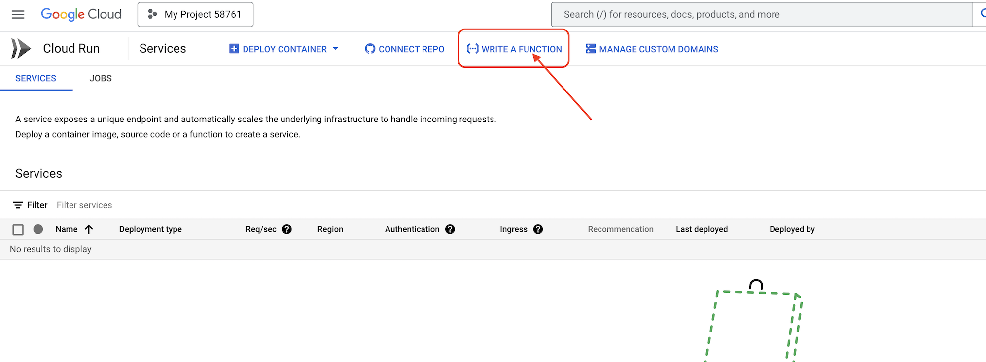 👉در یک برگه مرورگر دیگر، Google Cloud Console را در مرورگر وب خود باز کنید. در منوی پیمایش (☰)، به "Cloud Run" بروید. روی دکمه "+ ... WRITE A FUNCTION" کلیک کنید.