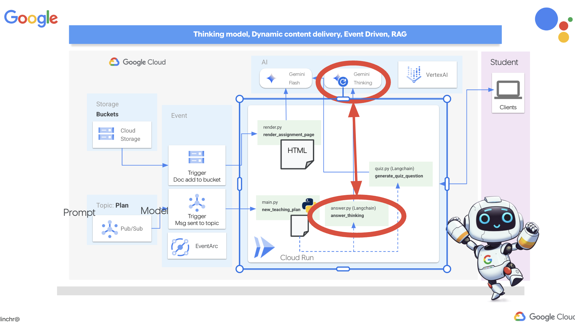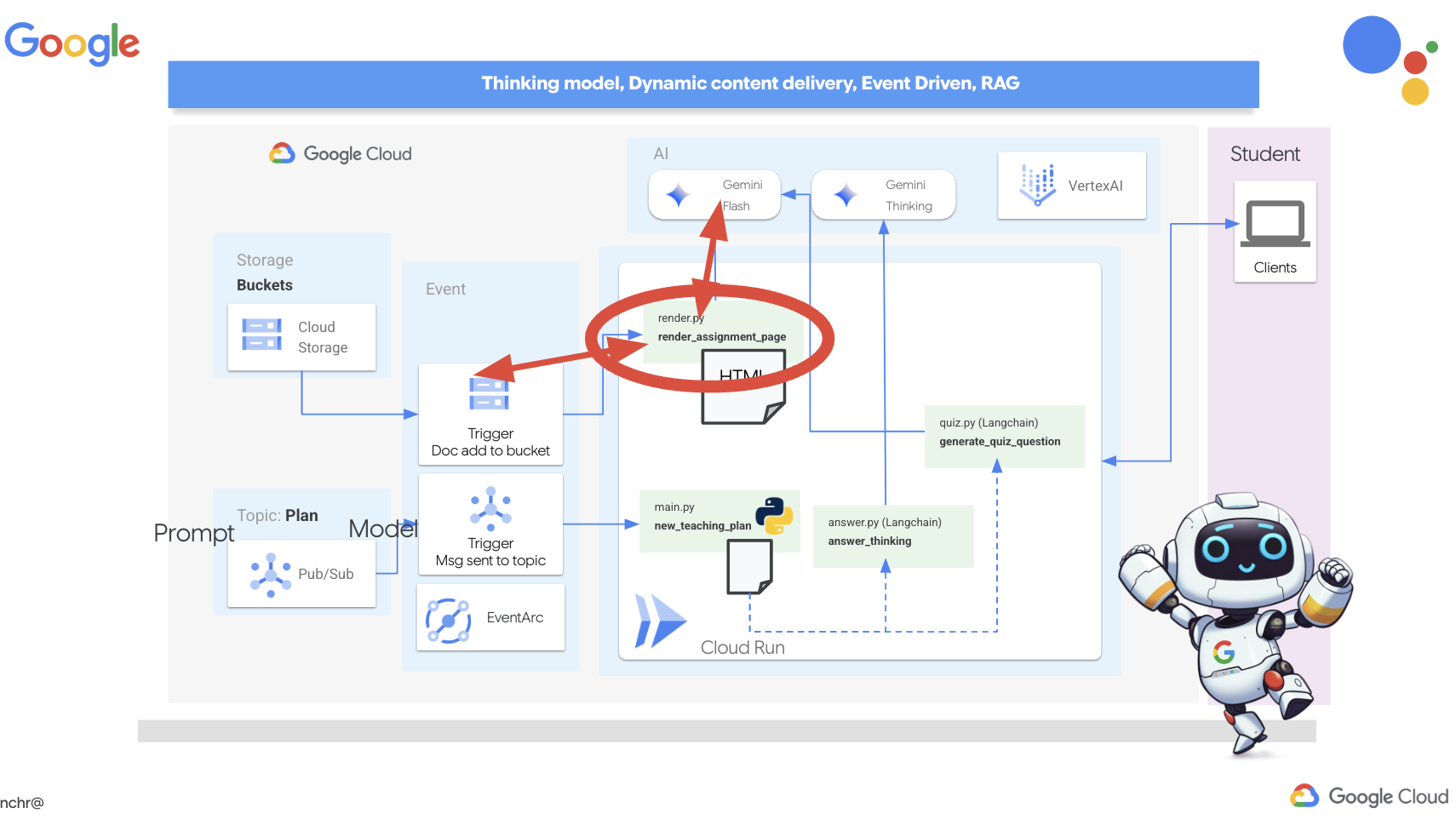در اصل، معماری ما قدرت LLM ها را با داده های ساختاریافته و ارتباطات مبتنی بر رویداد ترکیب می کند که همه در Google Cloud اجرا می شوند. این به ما امکان می دهد یک دستیار آموزشی مقیاس پذیر، قابل اعتماد و موثر بسازیم.