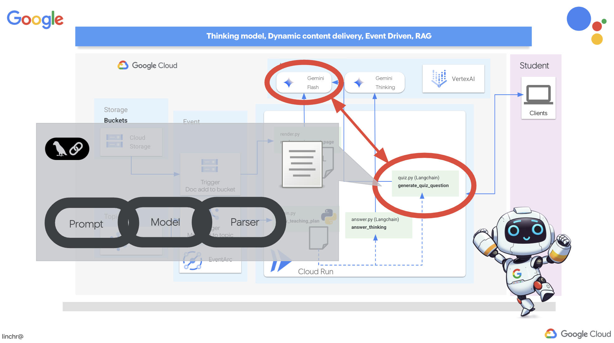 โดยพื้นฐานแล้ว สถาปัตยกรรมของเรารวมความสามารถของ LLM เข้ากับ Structured Data และการสื่อสารที่ทำงานตามเหตุการณ์ ซึ่งทั้งหมดนี้ทำงานบน Google Cloud ซึ่งช่วยให้เราสร้างผู้ช่วยสอนที่ปรับขนาดได้ เชื่อถือได้ และมีประสิทธิภาพ