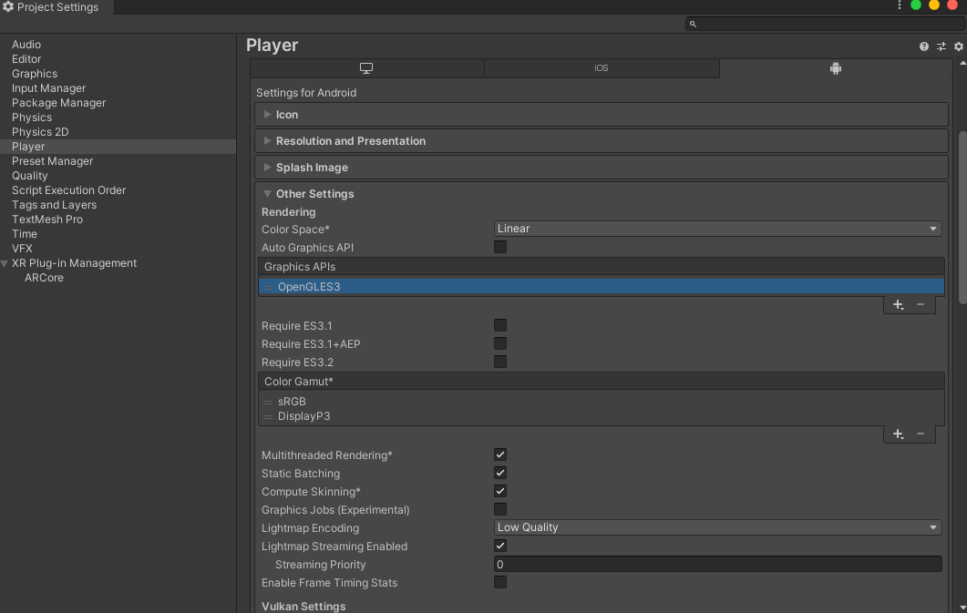 - Entfernen Sie auf dem Tab Android unter Other Settings (Weitere Einstellungen) Vulkan aus Graphics APIs (Grafik-APIs).