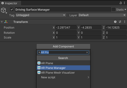 Driving Surface Managerolarak yeniden adlandır. Bu bileşen, oynatıcı tarafından seçilene kadar düzlemler gösterir. - Yeni oyun nesnesini seçin. AR Uçak Yöneticisi eklemek için İnceleme bölmesinde Bileşen Ekle'yi tıklayın.