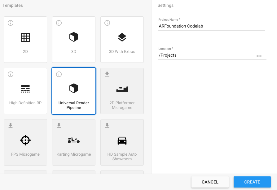 Crea un nuovo progetto utilizzando il modello Universal Render Pipeline. Assegna un nome descrittivo e una posizione appropriata, quindi premi CREA.