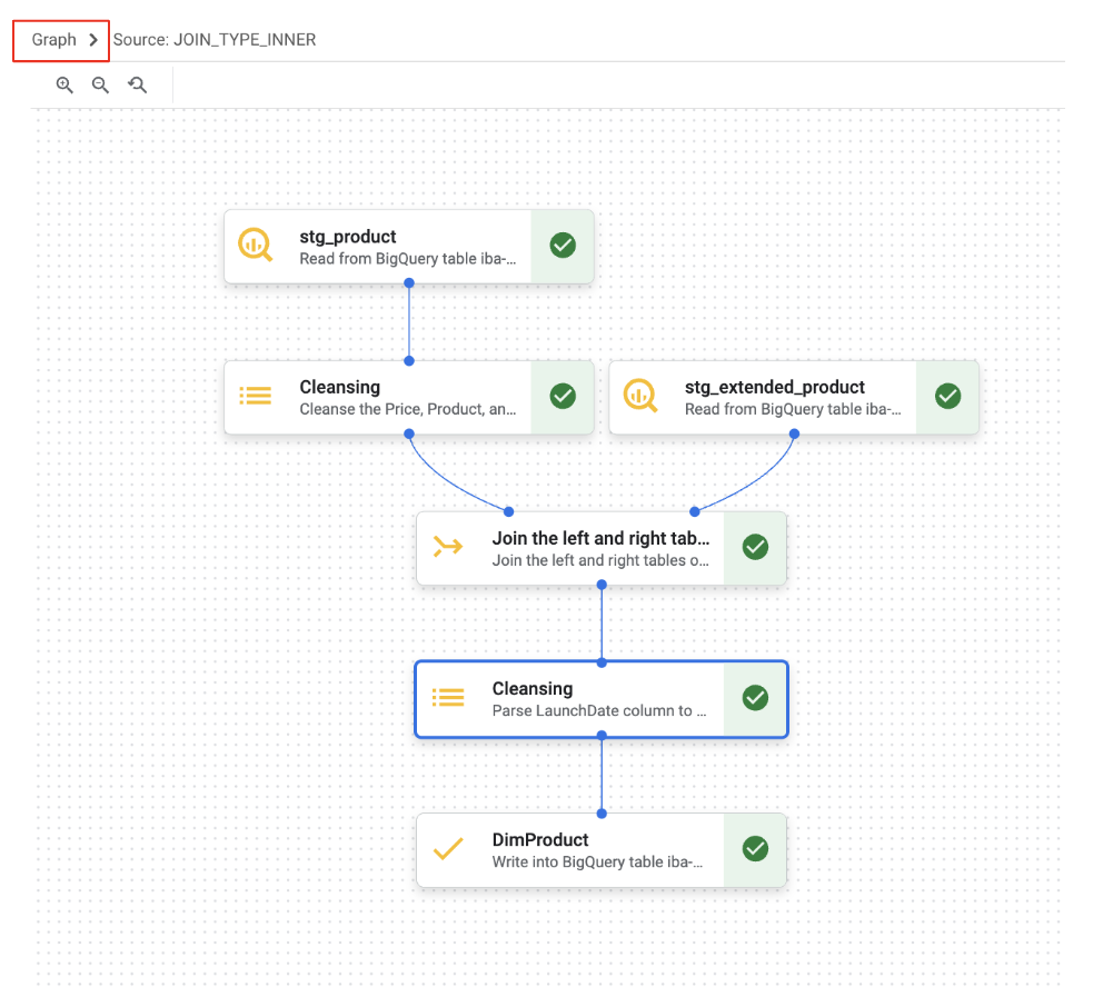 We've now worked with the "Data" and "Schema" tabs. In addition to these, BigQuery Data Preparation provides a "Graph" view that visually displays the sequence of transformation steps in your pipeline.