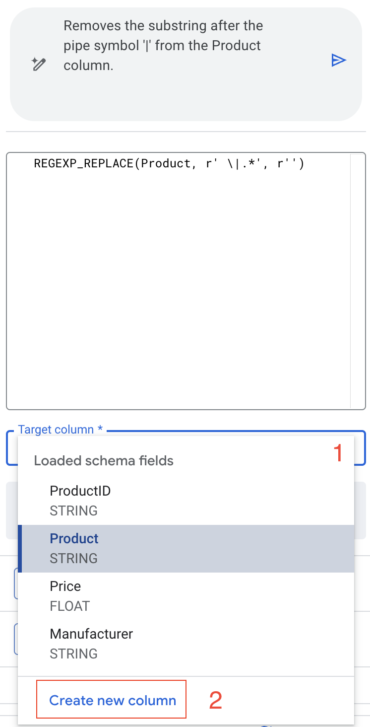Transformationfrom the dropdown menu - In the natural language prompt field, enter "extract the word after the pipe (|) in the Product column." then hit return to generate the SQL.