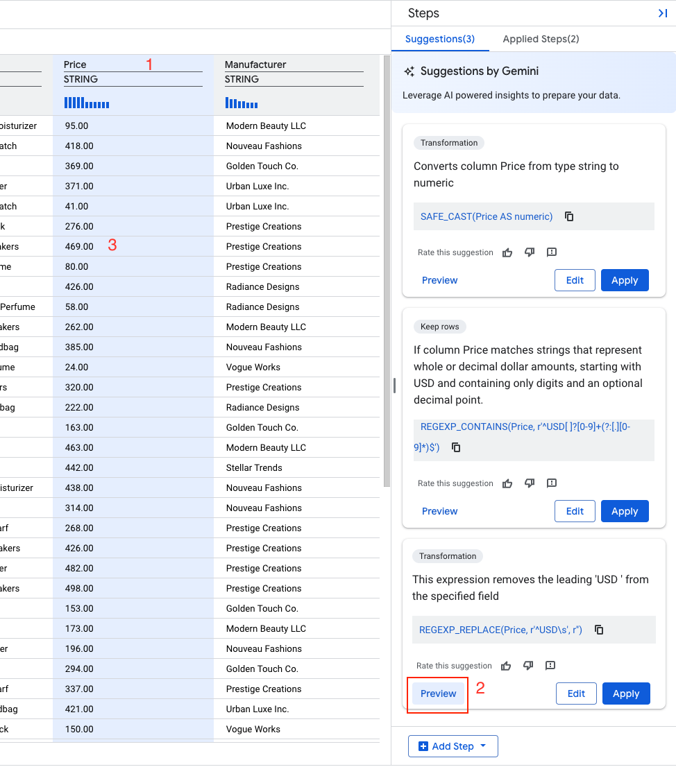 Right away, Gemini analyzes your data and suggests several transformations. In this example, we see a number of recommendations. In the next steps we will apply the ones we need.