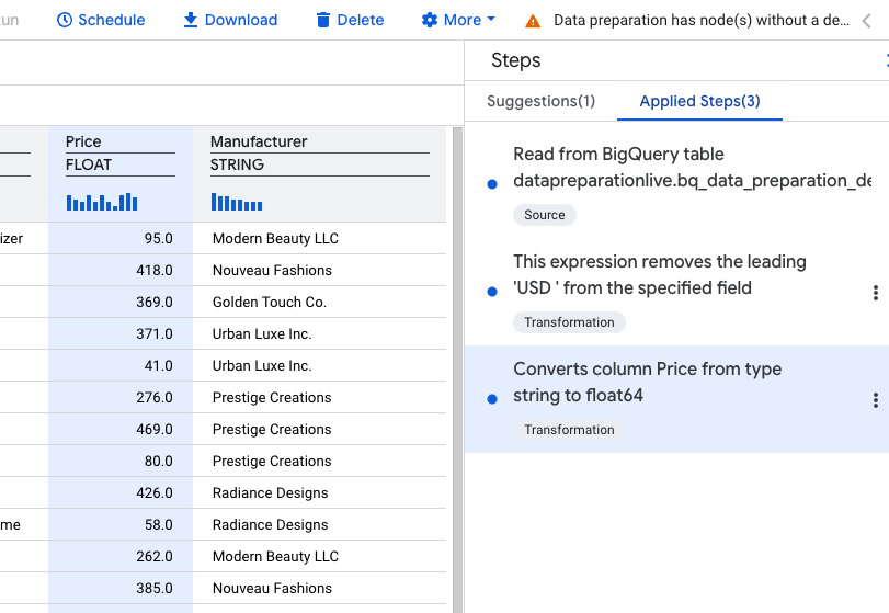 - Gemini will have likely identified a relevant transformation. Find the recommendation that is keeping only rows where the Manufacturer field is not empty. It will have SQL similar to: