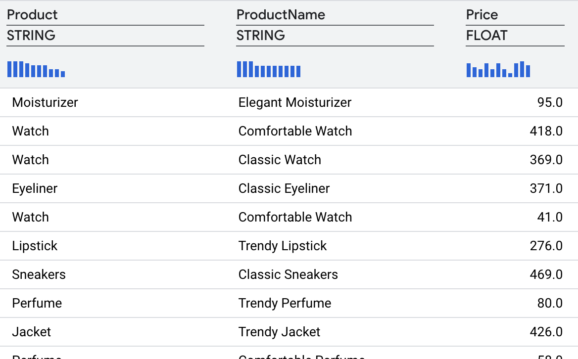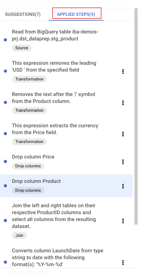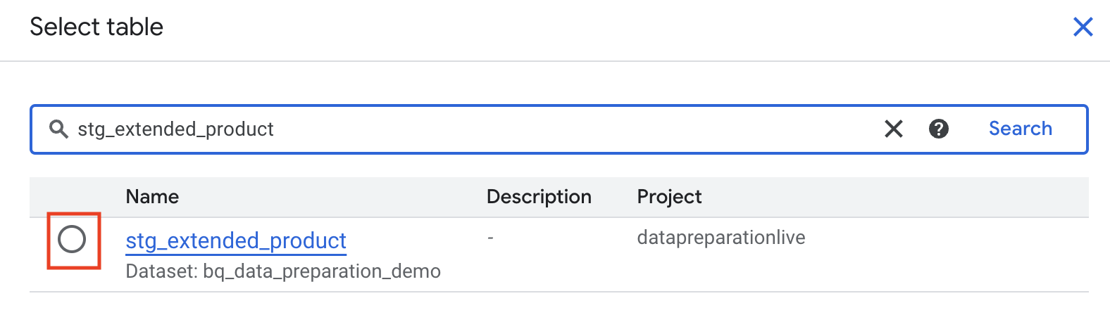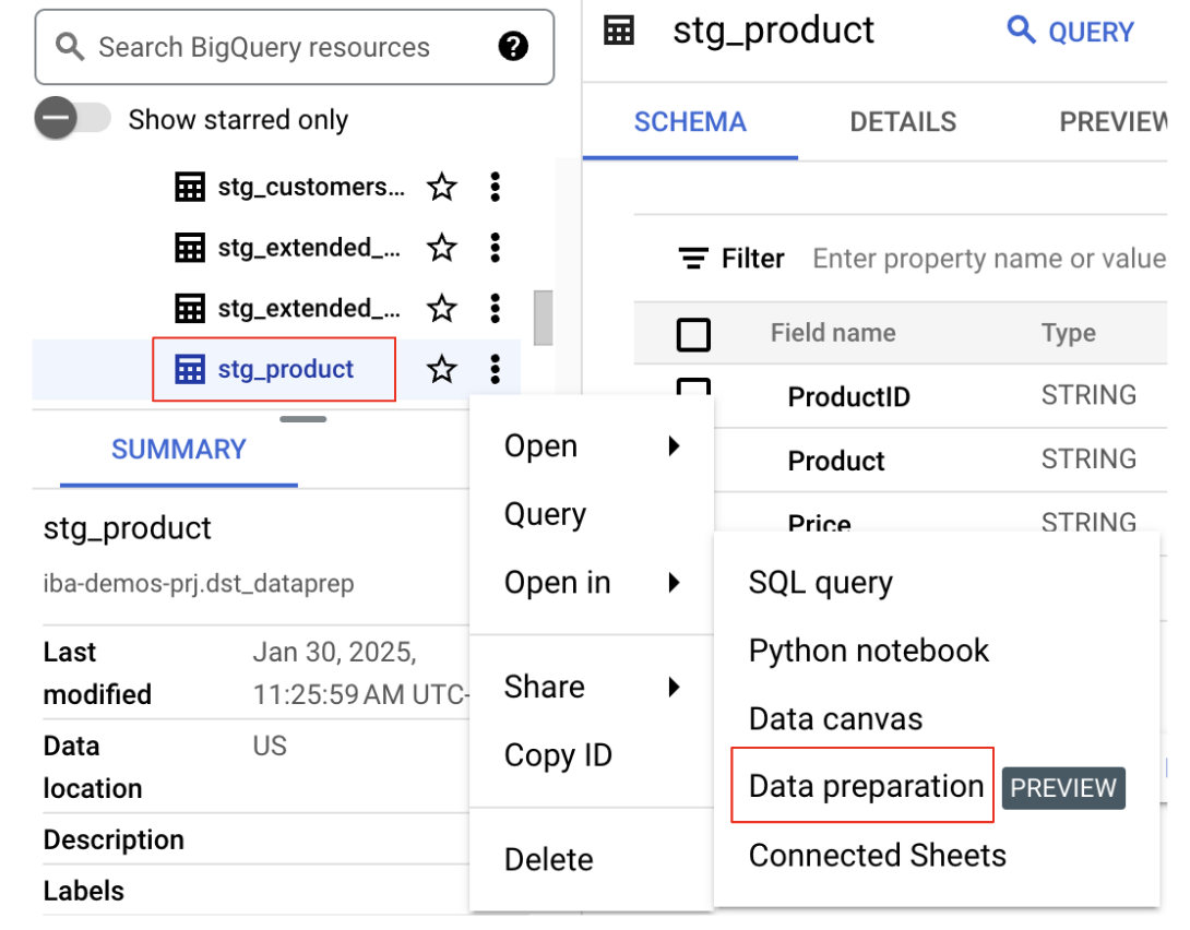 bq data preparation demolisting. Select thestg_producttable. - Open in Data Preparation: Click the three vertical dots next to the table name and select
