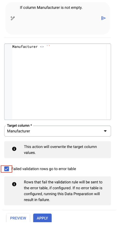 - Gemini will have likely identified a relevant transformation. Find the recommendation that is keeping only rows where the Manufacturer field is not empty. It will have SQL similar to: