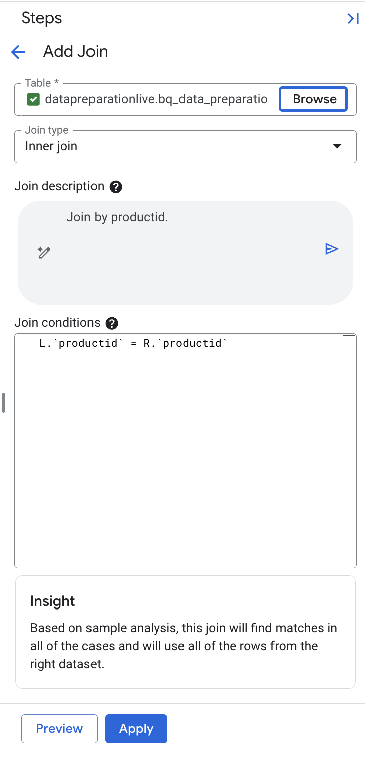 Gemini in BigQuery automatically picked the productid join key for us and qualified the left and right hand sides since the key name is identical.