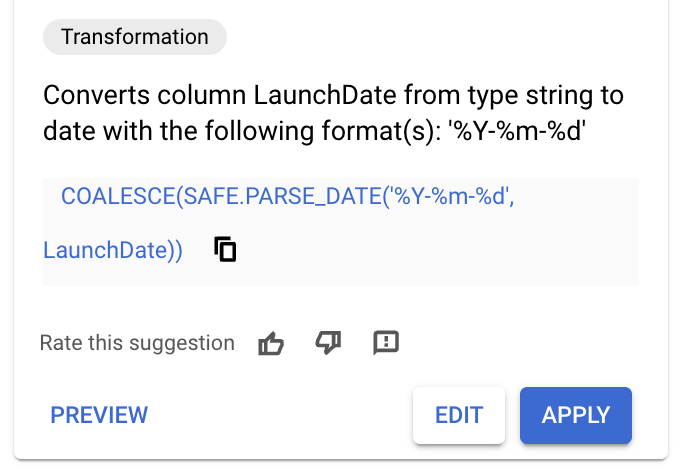 LaunchDatecolumn name. You should see some recommendations generated similar to the ones in the image below.