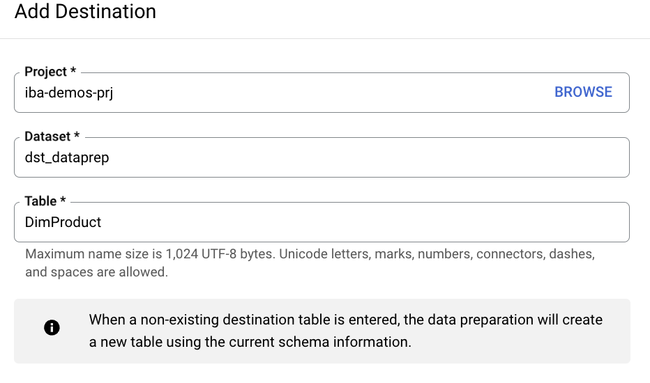 Data preparation never writes back into the source and we'll ask you to define a destination table to write into. The table we'll be working with for this exercise only has 1,000 rows to keep costs minimal but data preparation runs on BigQuery and will scale alongside.