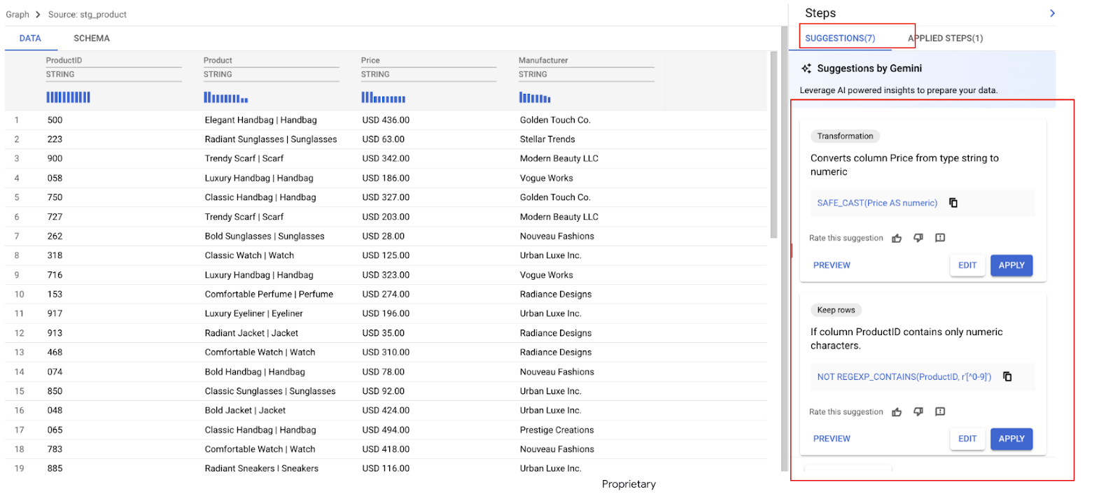 Right away, Gemini analyzes your data and suggests several transformations. In this example, we see a number of recommendations. In the next steps we will apply the ones we need.