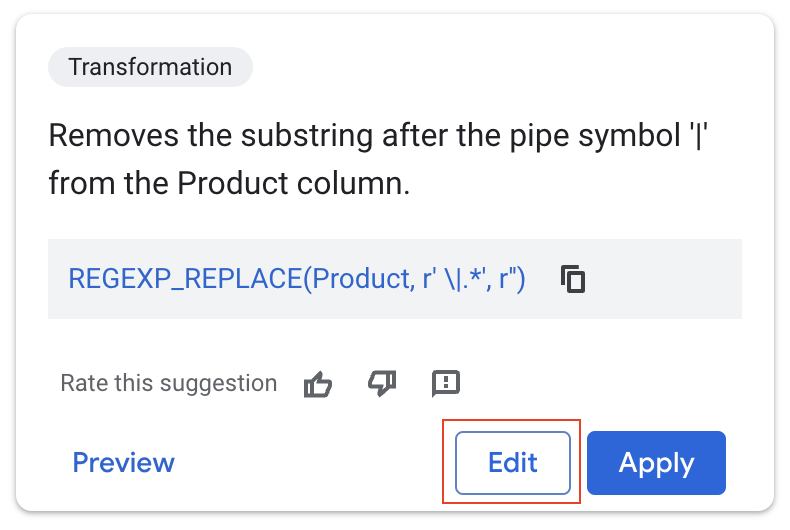 Transformationen el menú desplegable. - En el campo de instrucción de lenguaje natural, ingresa "extraer la palabra después de la barra vertical (|) en la columna Producto". Luego, presiona Intro para generar el SQL.
