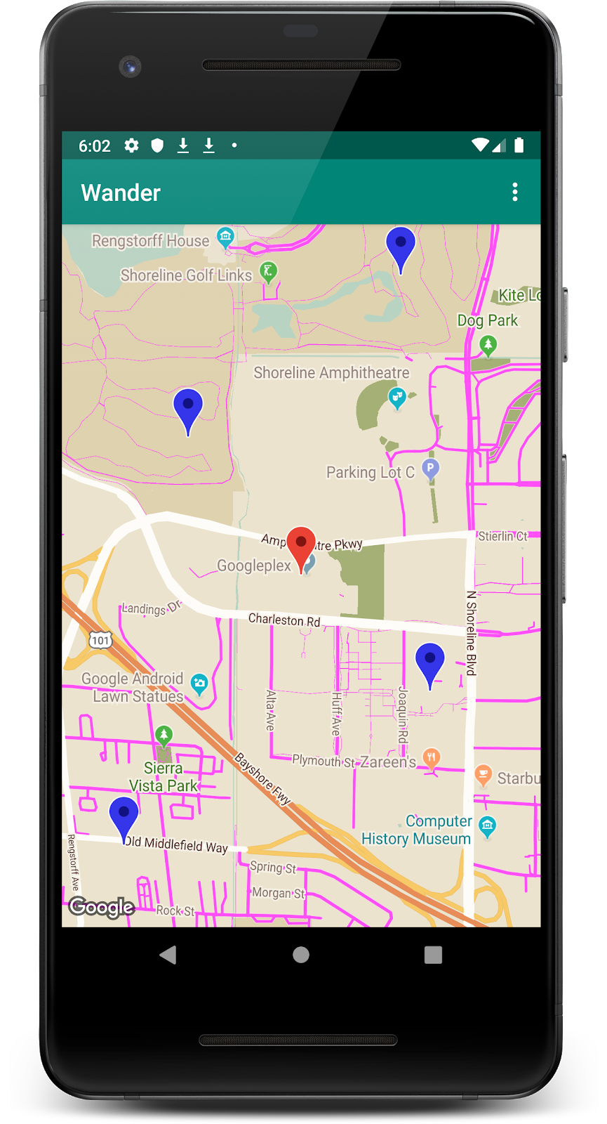 在此 Codelab 中,您会创建 Wander 应用,此应用显示包含自定义样式的 Google 地图。利用 Wander 应用,您可以将标记拖放到相应位置上、添加叠层,以及实时查看自己的位置。