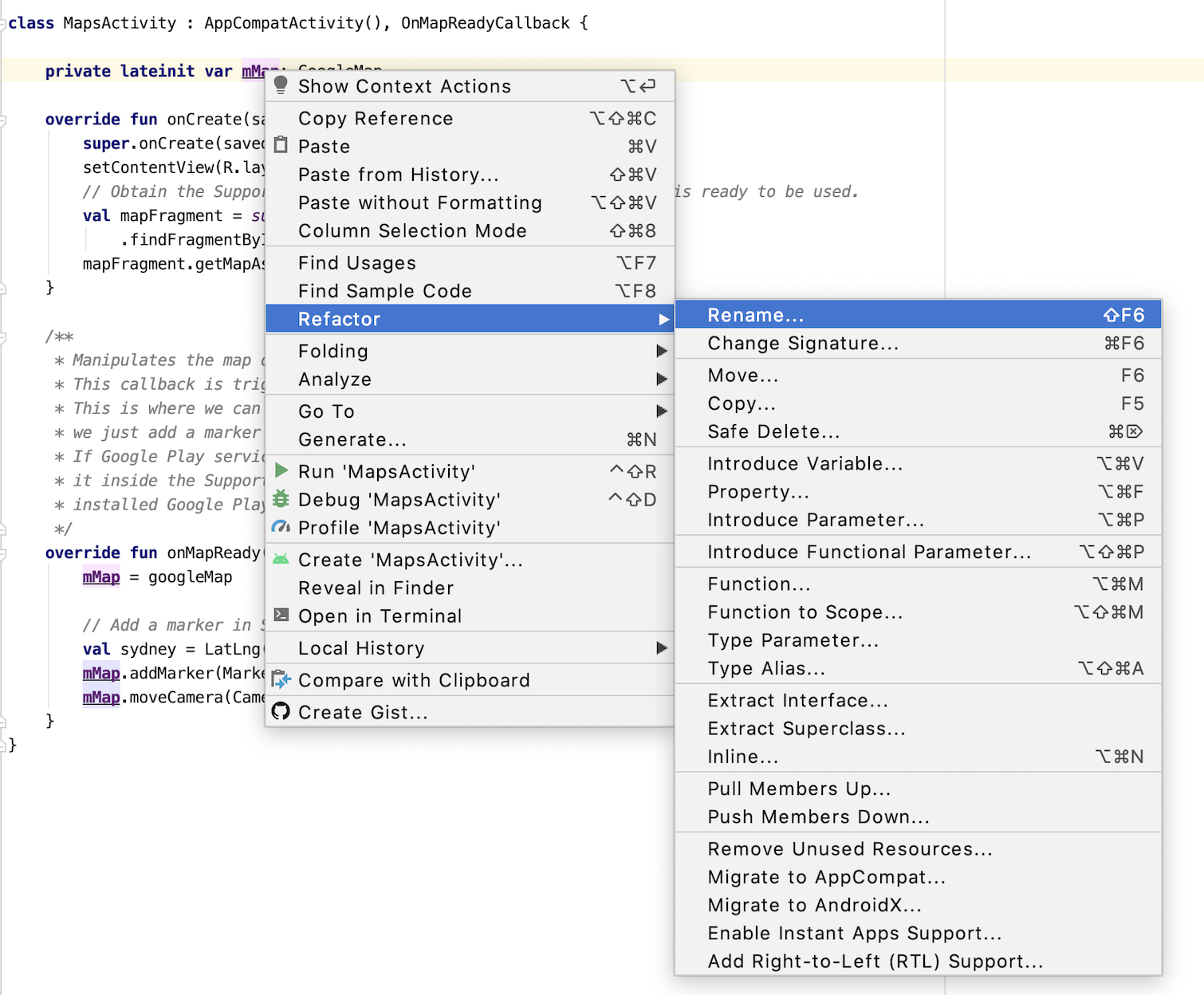 MapsActivity中,右键点击mMap,然后点击 Refactor >重命名...