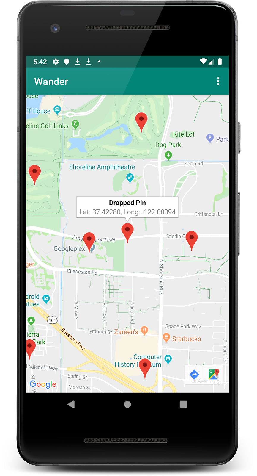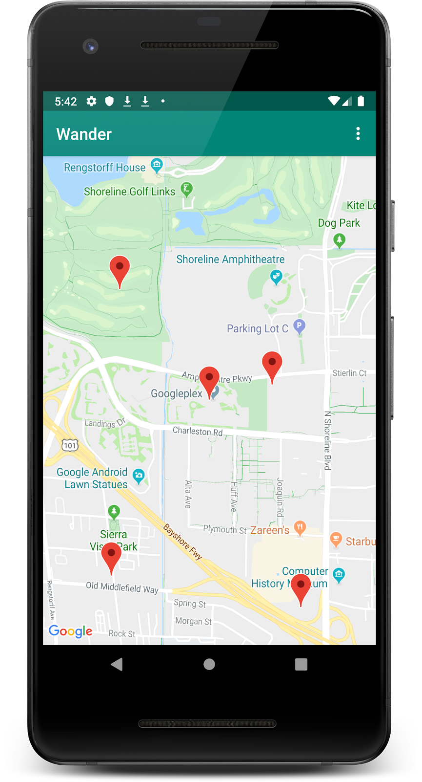 Wander, trong đó có một Google Maps được nhúng - Cách tạo tính năng tuỳ chỉnh cho ứng dụng, chẳng hạn như điểm đánh dấu và định kiểu