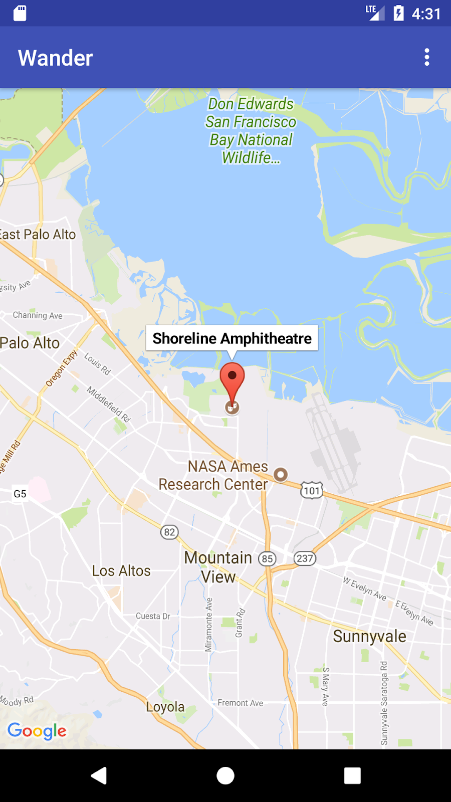 setPoiClick().への通話の後、onMapReady()後にsetInfoWindowClickToPanorama(mMap)に発信します- アプリを実行します。Google 本社の本社であるマウンテン ビューなど、ストリートビューを提供する都市にズームインし、公園などのスポットを探します。スポットをタップすると、マーカーを配置して情報ウィンドウを表示できます。情報ウィンドウをタップして、マーカーの位置のストリートビュー モードを開始します。[戻る] ボタンを押して地図フラグメントに戻ります。