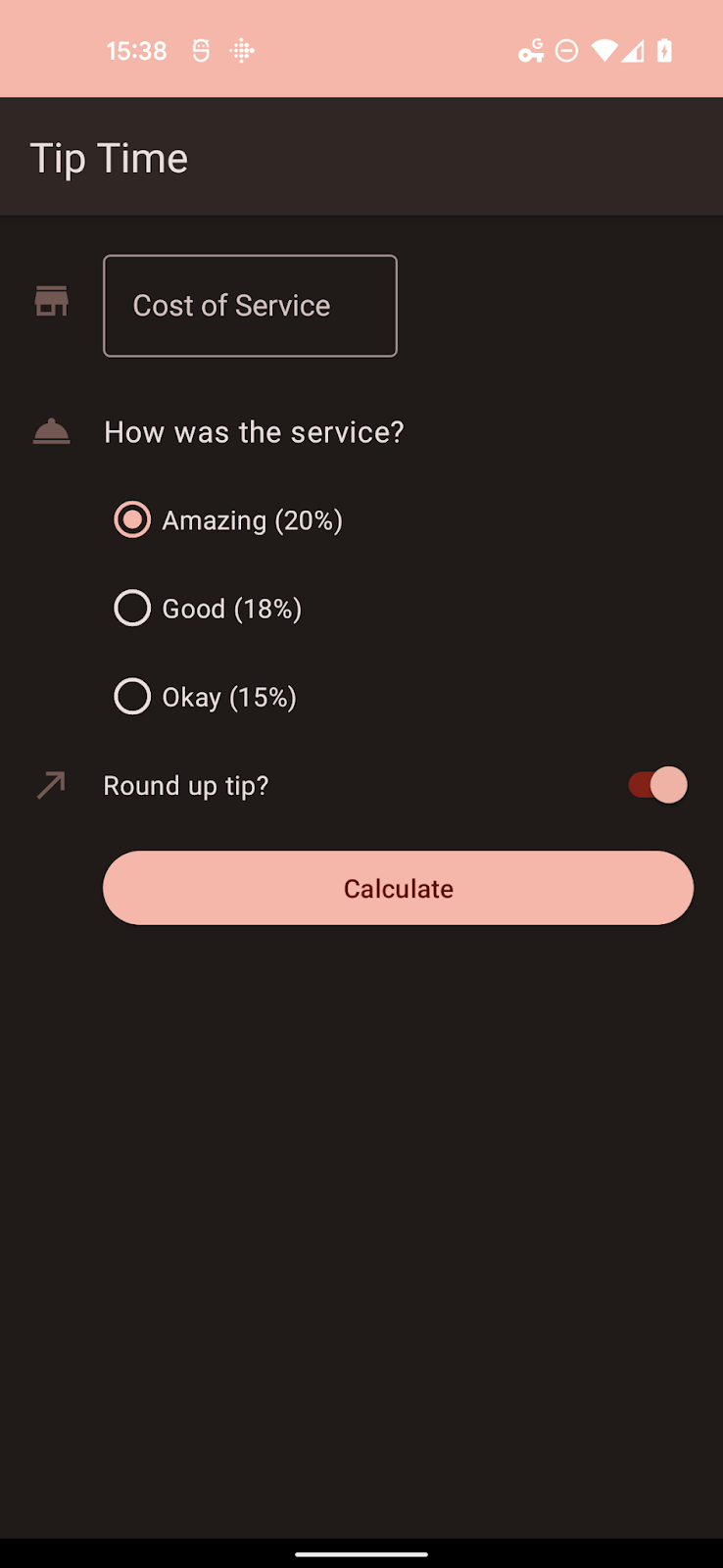 L'app Tip Time è un'app che calcola mance, con opzioni per la personalizzazione dei consigli. È una delle app di esempio del nostro corso di formazione Android Basics in Kotlin.