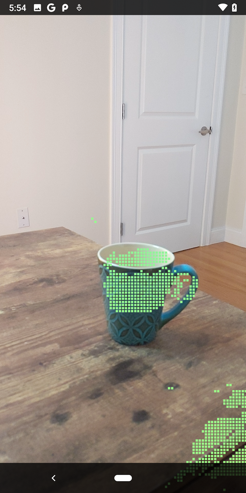 Menjalankan codelab sekarang akan menghasilkan subset titik yang dirender. Titik-titik ini merepresentasikan objek dalam adegan, sekaligus mengabaikan permukaan datar tempat objek berada. Anda dapat menggunakan data ini untuk memperkirakan ukuran dan posisi objek dengan mengelompokkan titik-titik.