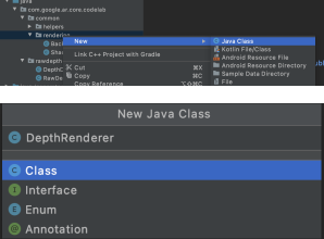 Ardından, her kare için derinlik görüntülerini almak üzere Depth API'yi çağırın. Yeni bir dosya oluşturarak derinlik verilerini yeni bir sınıfa kapsülleyin. rawdepth klasörünü sağ tıklayın ve New > Java Class seçeneğini belirleyin. Bu işlem, boş bir dosya oluşturur. Bu sınıfa aşağıdakileri ekleyin: