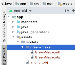 ใน Android Studio ให้เพิ่ม GreenMaze.obj ลงในไดเรกทอรีชิ้นงานของโปรเจ็กต์ เพื่อให้โหลดขณะรันไทม์ได้ คัดลอก GreenMaze.obj