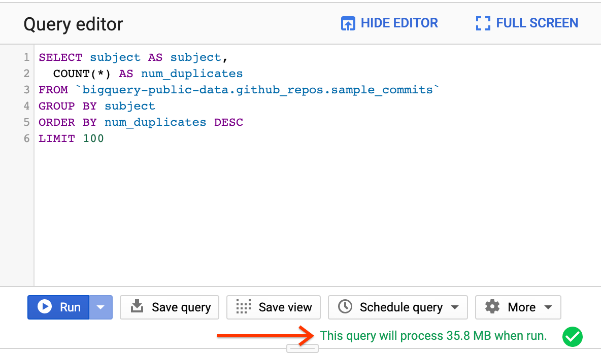 Dado que el conjunto de datos de GitHub es grande, es útil usar un conjunto de datos de muestra más pequeño mientras se experimenta para ahorrar costos. Usa los bytes procesados debajo del editor para estimar el costo de la consulta.