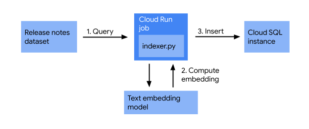 Bevor Sie mit dem Erstellen der Webanwendung beginnen, sollten Sie prüfen, ob die Cloud Run-Releasenotes in der Cloud SQL-Datenbank indexiert sind. In diesem Abschnitt erstellen Sie einen Indexierungsjob, der Folgendes tut: