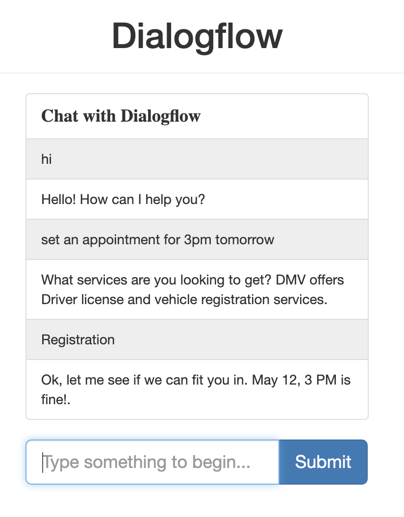 • Sie testen eine Dialogflow-Anwendung über dieses benutzerdefinierte Front-End.