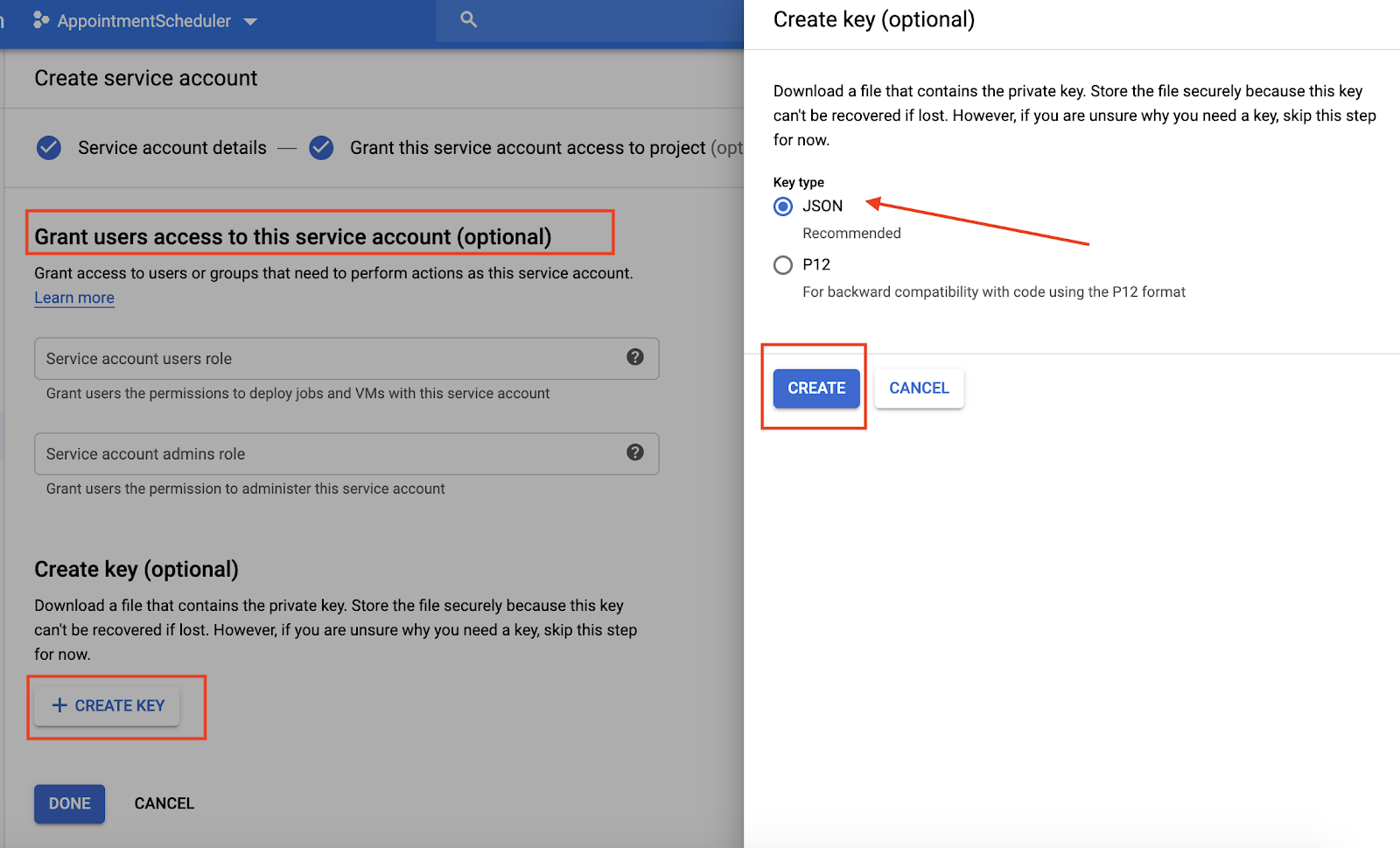 2. Klicken Sie unter Nutzern Zugriff auf dieses Dienstkonto gewähren (optional) die Option Schlüssel erstellen > JSON > Erstellen: