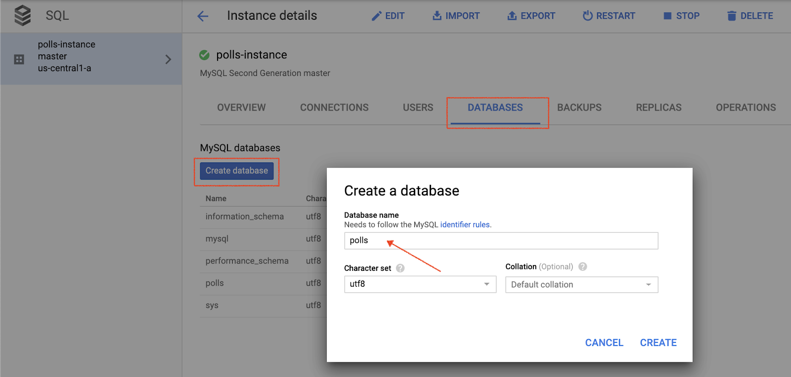 1. Tạo một cơ sở dữ liệu mới bằng Google Cloud Console cho phiên bản Cloud SQL có tên là polls-instance. Ví dụ: bạn có thể nhập "cuộc thăm dò ý kiến" làm tên. a3707ec9bc38d412.png