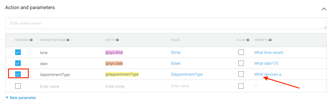 - 您需要將 AppointmentType 設為必填欄位,就像時間和日期一樣。如要這麼做,請前往「動作和參數」,然後選取「AppointmentType」列中的核取方塊。